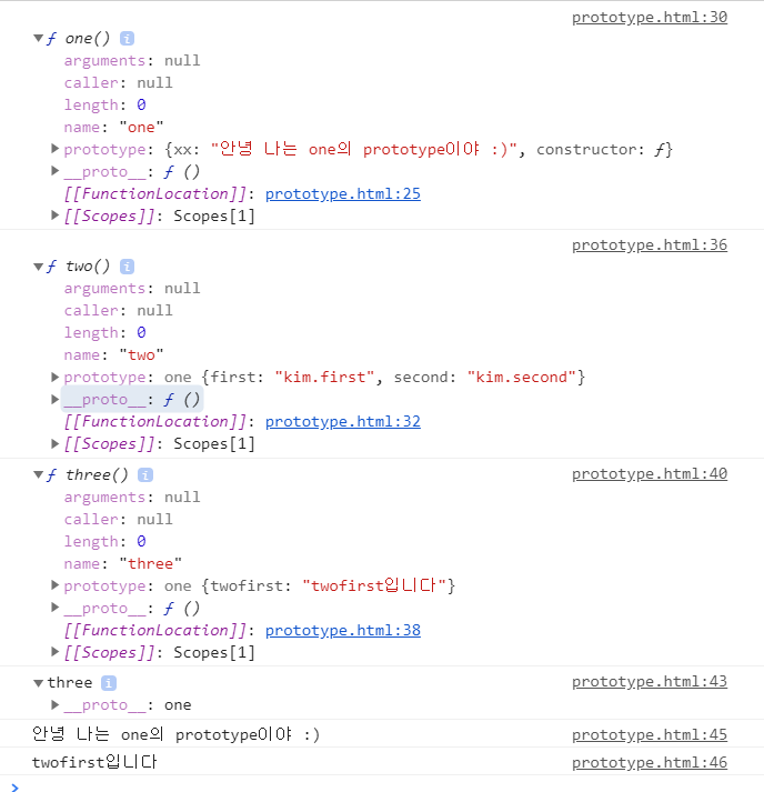 one에는 one의 prototype.xx 를 넣었다.(뭔소리를 하는건지 모르겠네.) 아무튼 이렇게 하고 콘솔을 찍어보았다.