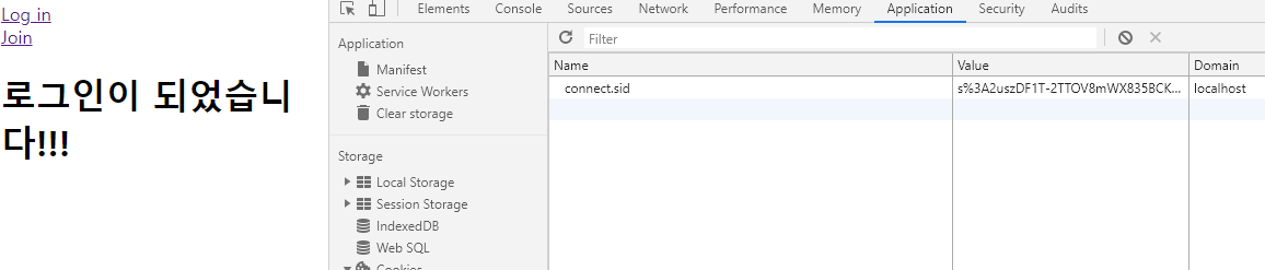 쿠키가 저장되고 메세지도 바뀌는걸 볼 수 있다. 즉 로그인 된 상태라는걸 알 수 있다.
